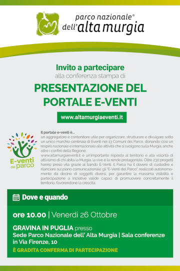 www.altamurgiaeventi.it è un'importante risposta al territorio e alla volontà di attivismo di chi abita la Murgia, la vive e la rende protagonista. Oltre 230 progetti hanno preso vita grazie al bando E-Venti. Il Parco ha il dovere di custodire e rilanciare sul piano comunicazionale gli "E-Venti del Parco", realizzati autonomamente da decine di soggetti diversi, per garantire la massima visibilità e partecipazione a iniziative valide capaci di promuovere concretamente il territorio, favorendone la crescita.