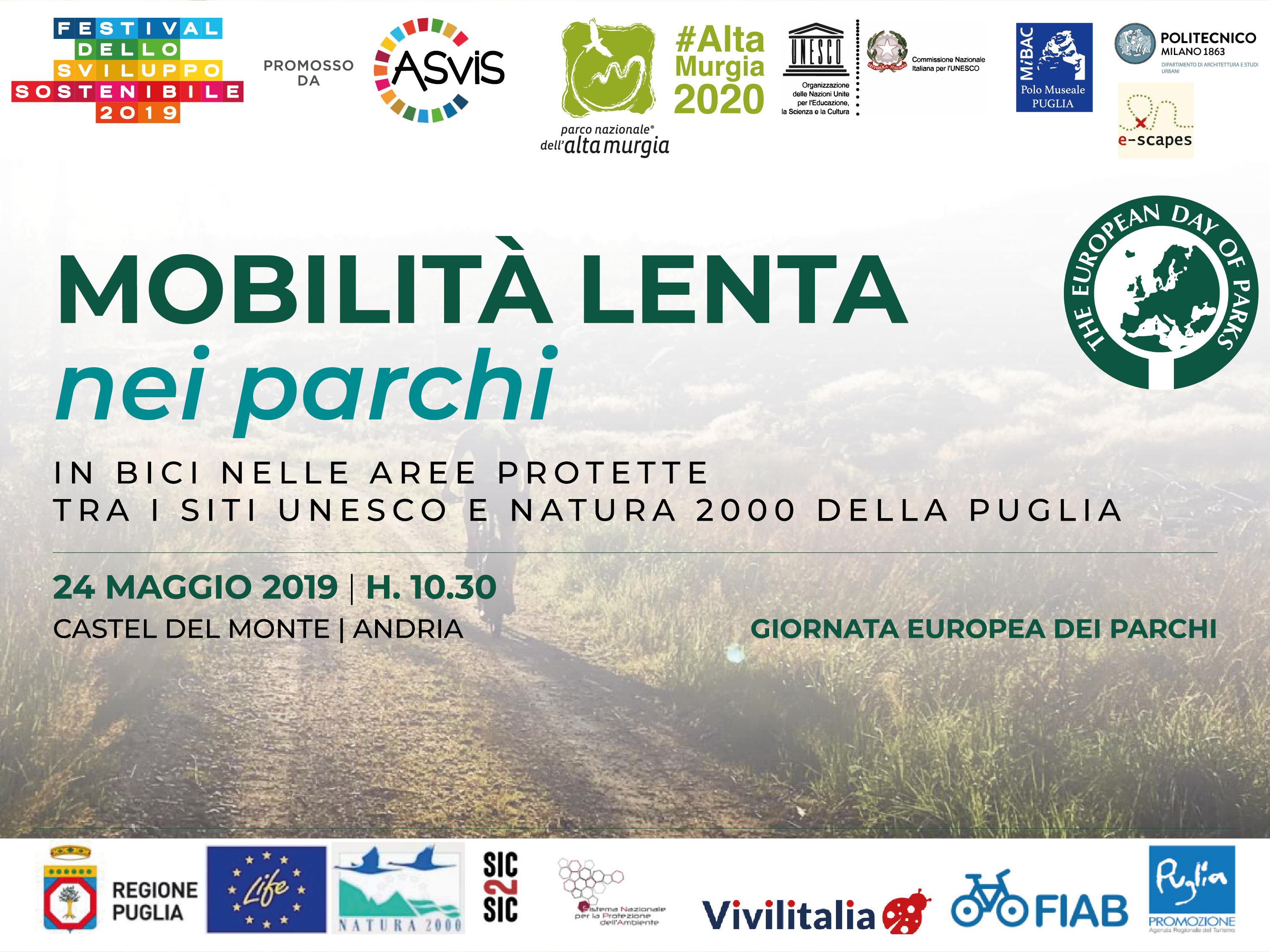 Nel Parco Nazionale dell’Alta Murgia le celebrazioni per la Giornata Europea dei Parchi si inseriscono proprio nel Festival dello Sviluppo Sostenibile 2019, la più grande iniziativa italiana per sensibilizzare e mobilitare cittadini, giovani generazioni, imprese, associazioni e istituzioni sui temi della sostenibilità economica, sociale e ambientale, organizzata dall’ASviS (Alleanza Italiana per lo Sviluppo Sostenibile) per diffondere la cultura della sostenibilità e realizzare un cambiamento culturale e politico che consenta all’Italia di attuare l’Agenda 2030 delle Nazioni Unite e centrare i 17 Obiettivi di sviluppo sostenibile. “Mobilità lenta nei Parchi - In bici nelle Aree Protette tra i Siti UNESCO e Natura 2000 della Puglia” è, dunque, il tema del tavolo di lavoro che si terrà venerdì 24 maggio, a partire dalle 10:30, a Castel del Monte, promosso dal Parco Nazionale dell’Alta Murgia in collaborazione con la Commissione Nazionale Italiana per l’UNESCO, il MiBAC e il Politecnico di Milano.