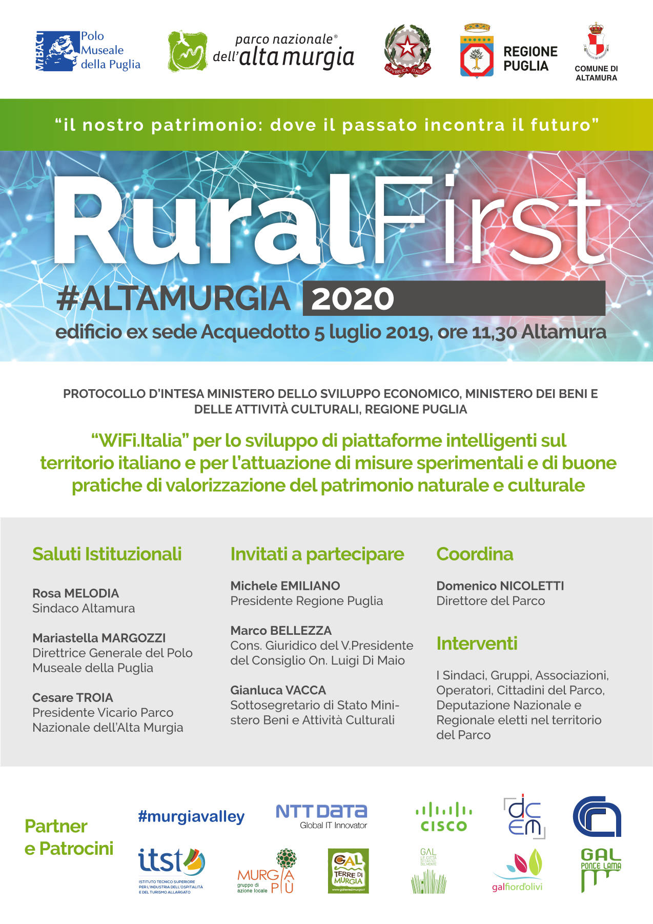 Alla presenza del Presidente della Regione Puglia Michele Emiliano, del Sottosegretario di Stato del Ministero dei Beni e delle Attività Culturali Gianluca Vacca, del Consigliere giuridico del Ministro Di Maio, Marco Bellezza, dei sindaci, operatori e cittadini, delle deputazioni nazionali e regionali, il Parco Nazionale dell’Alta Murgia e il Polo Museale della Puglia presentano una nuova sfida culturale per l’area murgiana: la diffusione delle connettività nelle aree rurali, infatti, significa esaltare valori e contenuti del Capitale Naturale e Culturale, per la qualità della vita di tutti noi.