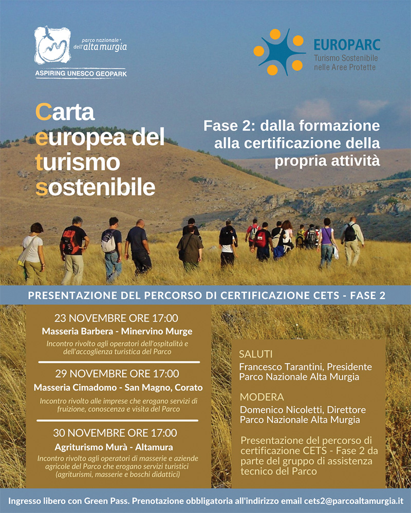 Gravina in Puglia, 22 novembre 2021. Al via ufficiale nel Parco dell’Alta Murgia la fase 2 della Carta Europea del Turismo Sostenibile (CETS) per certificare le aziende nell’area protetta con il marchio legato alla sostenibilità in ambito turistico. Il percorso per ottenere la certificazione verrà illustrato in un ciclo di incontri di presentazione in programma il 23, 29 e 30 novembre nelle masserie del Parco, rivolti rispettivamente alle aziende dell’ospitalità e dell’accoglienza turistica, alle imprese che erogano servizi di fruizione, conoscenza e visita del Parco e agli operatori di agriturismi, masserie e boschi didattici che erogano servizi turistici di promozione del territorio. «Con l’avvio della fase 2 – dichiara Francesco Tarantini, presidente PNAM – il Parco dell’Alta Murgia entra nel vivo della Carta Europea del Turismo Sostenibile per un nuovo modello di marketing territoriale, più incline alla sostenibilità ambientale e allo sviluppo delle comunità locali. Nei prossimi mesi le aziende avranno a disposizione un gruppo di tecnici per guidarle nel percorso di certificazione, dotandosi di strumenti più efficaci per migliorare l’offerta turistica. L’obiettivo è sviluppare prodotti turistici nel rispetto dell’ambiente, incrementando il flusso di visitatori e distinguendosi nel panorama europeo come Parco che guarda alla sostenibilità».