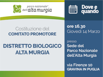 Si terrà giovedì 14 marzo 2019 alle ore 16:30, presso la sede del Parco Nazionale dell’Alta Murgia in via Firenze n. 10 a Gravina in Puglia, la sottoscrizione del documento di costituzione del Comitato Promotore del Distretto Biologico dell’Alta Murgia.