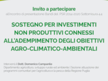 Mercoledì 14 novembre, alle ore 16:00, presso la sede del Parco Nazionale dell’Alta Murgia, in via Firenze 10 a Gravina in Puglia, si terrà un incontro di presentazione dei bandi del “PSR 2014-2020. Sottomisura 4.4. Sostegno per investimenti non produttivi connessi all’adempimento degli obiettivi agro-climatico-ambientali”.