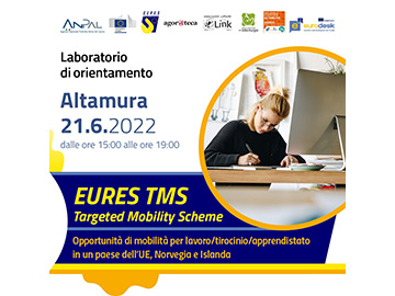 Nell'ambito delle attività di promozione del programma europeo EURES TMS si realizzerà un evento/laboratorio ad Altamura il 21 Giugno 2022, dalle ore 15:00 alle 19:00, presso l’Agorateca – Biblioteca di Comunità in via Stefano Lorusso 1.